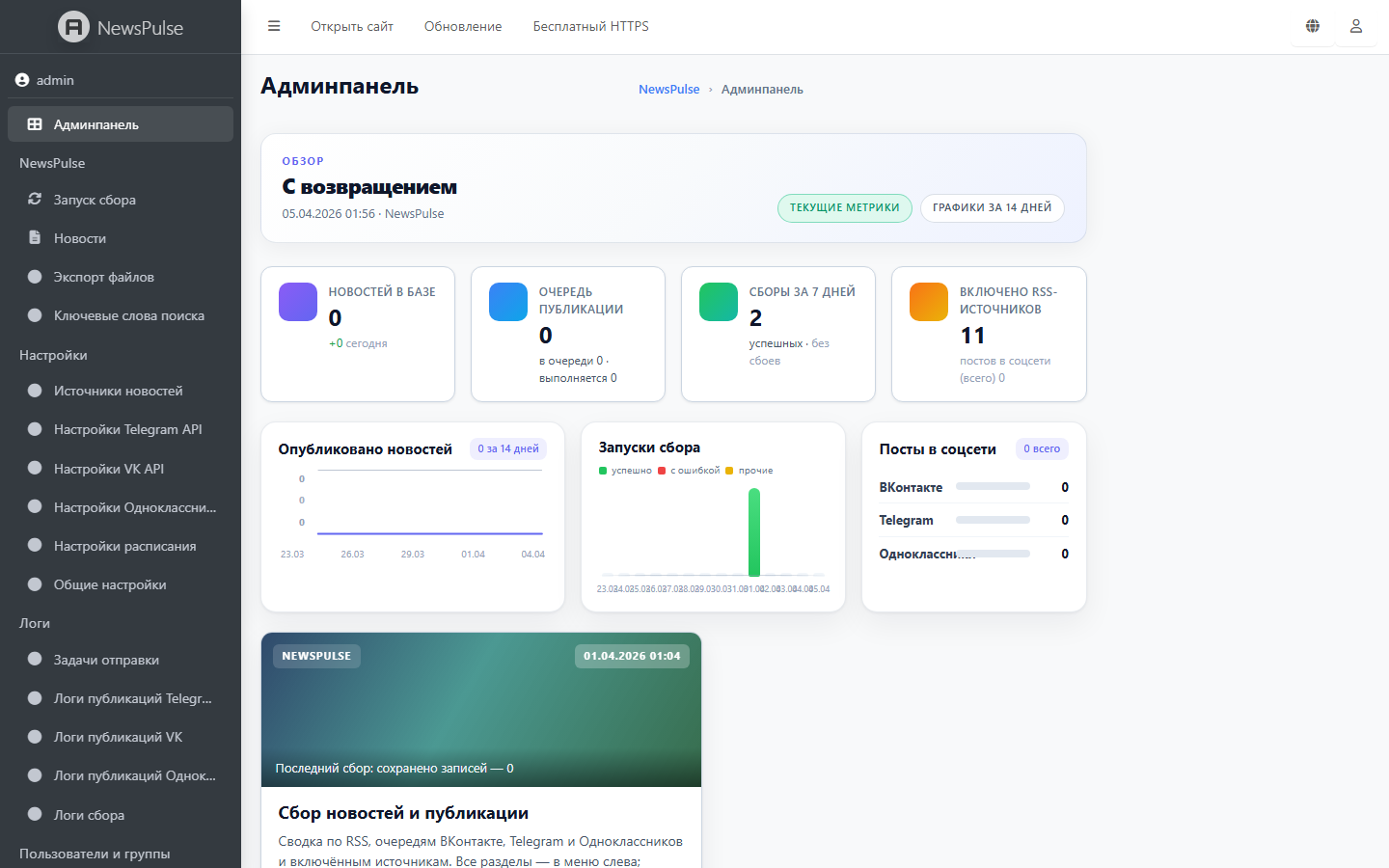 NewsPulse pulls stories by your rules, keeps them in one admin workspace, and queues publishing to VK, Telegram, and Odnoklassniki. You edit and ship—instead of forwarding links in chats or stitching tools together by hand.