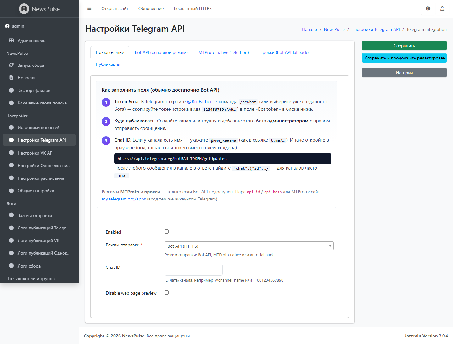 If RSS feeds or social APIs can’t be reached directly—common on corporate networks, under strict security policy, or with regional limits—you can route news collection and, separately, publishing to VK, Telegram, and Odnoklassniki through proxies. Everything is configured in the admin UI, with no code changes.